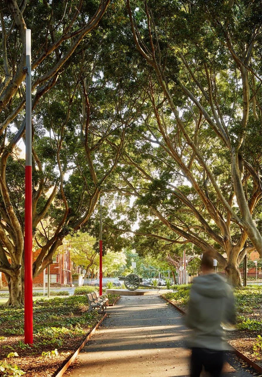 The forecourt, at the entry to the historic Duncan Thompson Stand was redesigned as a new square with a grove of closely planted palm trees. New lighting highlights the building’s richly textured heritage façade while circular red benches and red ‘seamed’ tree grates pay homage to the many games of cricket played at the field. Tunks Way, the fig lined axial path was reconceived as a commemorative walk, with an expanded path, low gardens, new seating, and lighting. The walk links the War memorial on the ridge to a relocated WW1 Field Gun in the valley on Falcon Street. A line of light columns, partially painted in red, evokes the solemn procession of war and memory.